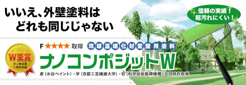 塗膜は紫外線や降雨により色や艶が劣化します。ナノコンポジットWは、紫外線や降雨に非常に強いシリコン化合物を塗膜中に導入すること(当社独自のリアルシリコンテクノロジー)により、この変色が最小限に抑えられています。